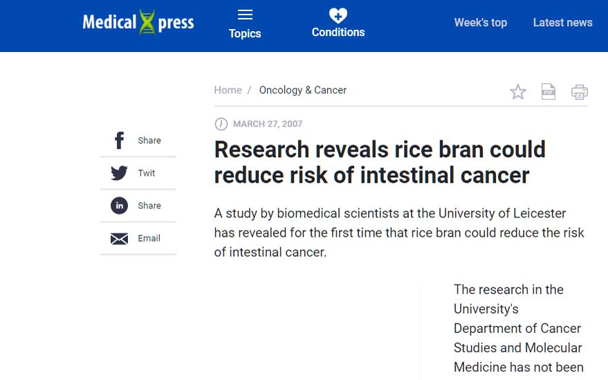 A study by biomedical scientists at the University of Leicester has revealed for the first time that rice bran could reduce the risk of intestinal cancer…. The results of a controlled laboratory study in a preclinical model of gastrointestinal adenoma demonstrated that consumption of a daily dose of stabilized rice bran caused an average 51% reduction in the number of precancerous adenomas in the intestinal tract.