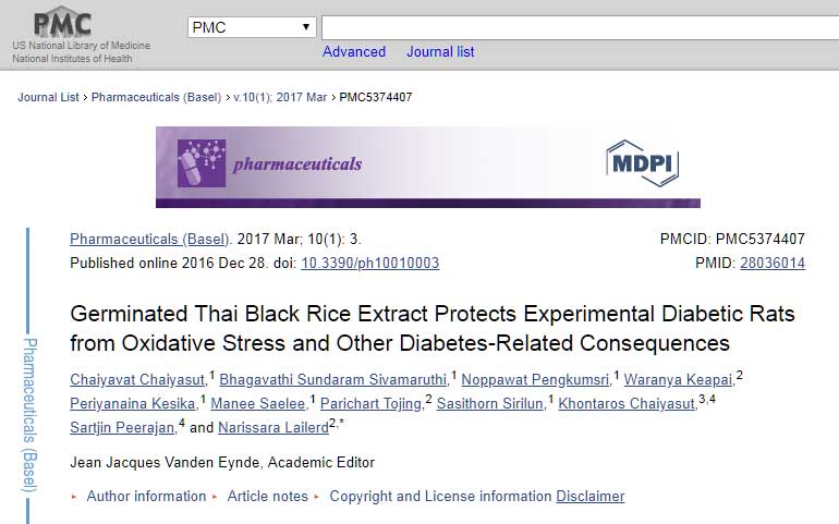 Germination enhanced the GABA content of BR, and GBRE (Germinated Black Rice extract) intervention improved the total antioxidant capacity and antioxidant enzymes levels in diabetic rats. The plasma glucose, cholesterol, triglyceride levels, insulin resistance and glucose tolerance were reduced, and the degree of insulin secretion in rat plasma was significantly increased upon GBRE treatment. Both pre and post-treatment approaches showed the anti-diabetic ability of GBRE.