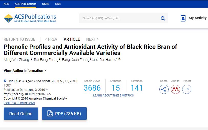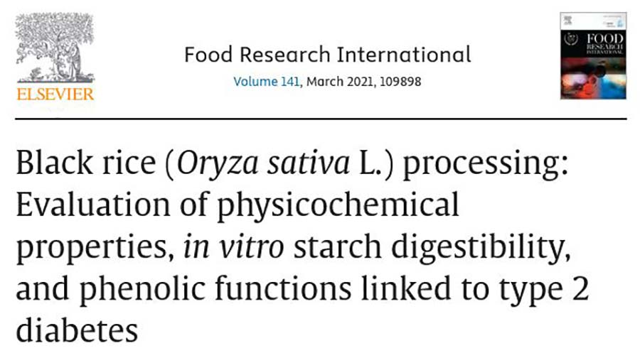 Rice (Oryza sativa L.) is a fundamental source of calorie intake and energy hemostasis. Black rice is a whole grains type that is not only a source of carbohydrate and fibers but also characterized by substantial contents of diverse classes of bioactive metabolites include phenolic acids, flavonoids, anthocyanins, proanthocyanidins, and tocotrienols (Melini et al., 2019, Zaupa et al., 2015). Accumulating epidemiological studies advocate for the numerous health-promoting qualities of black rice phenolics, including ameliorating oxidative stress and chronic diseases such as cancer, cardiovascular diseases, and progressive metabolic disorders such as type 2 diabetes and obesity (Deng et al., 2013).