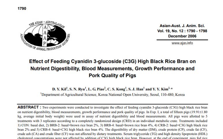 These results suggested that C3G high black rice bran might have an effect on serum cholesterol concentration and lipid stability of pork. It is supposed that these effects might be due to high concentration of antioxidative compounds, C3G in black rice bran.