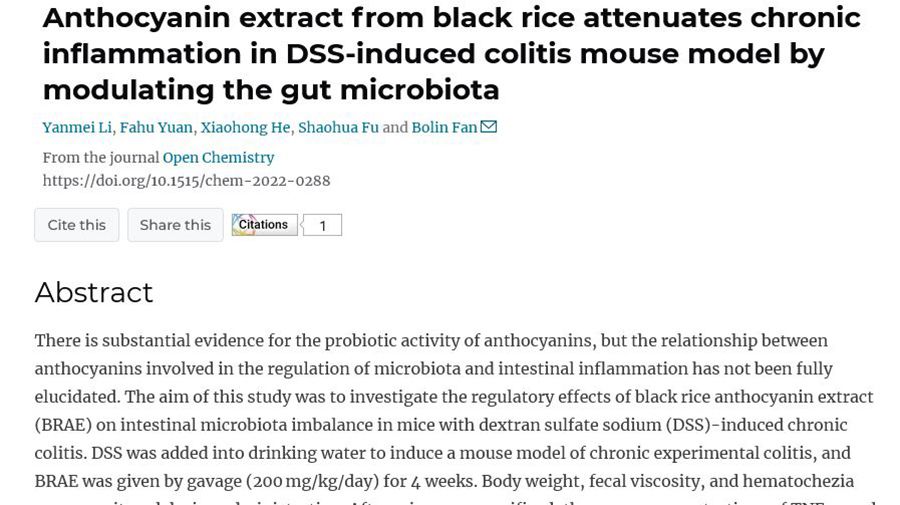 There is substantial evidence for the probiotic activity of anthocyanins, but the relationship between anthocyanins involved in the regulation of microbiota and intestinal inflammation has not been fully elucidated. The aim of this study was to investigate the regulatory effects of black rice anthocyanin extract (BRAE) on intestinal microbiota imbalance in mice with dextran sulfate sodium (DSS)-induced chronic colitis. ………. The results showed that BRAE significantly suppressed DSS-induced colonic inflammatory phenotypes and maintained colon length in mice. In addition, BRAE reduced intestinal permeability and improved intestinal barrier dysfunction in mice with colitis.